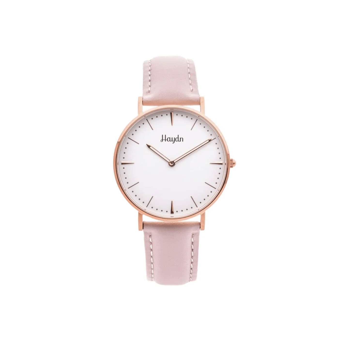 • التفاصيل: عقارب الساعة رفيعة وذهبية اللون، واسم العلامة التجارية “Haydn” مكتوب بخط أنيق أسفل موضع الساعة 12.